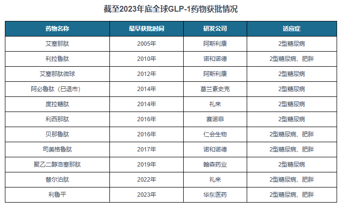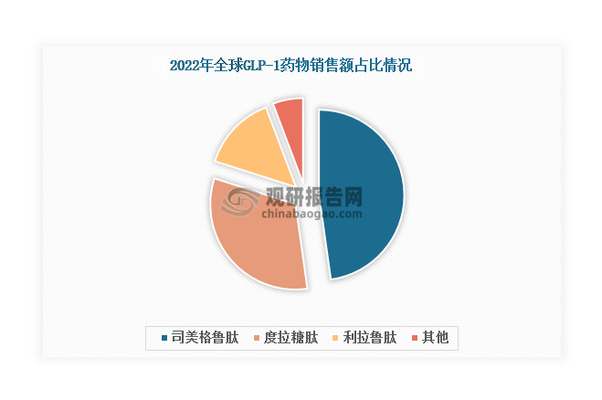 [{“type”: “page”, “title”: “GLP-1药物行业:中国及全球销售额快速增长 国内市场份额主要被外资企业占据_我国_天下_整理”, “url”: “https://www.sohu.com/a/887505588_730526”, “content”: “1.全球GLP-1药物销售额快速增长,司美格鲁肽占比最大 根据观研报告网发布的《中国GLP-1药物行业现状深度研究与发展前景预测报告(2024-2031年)》显示,GLP-1药物即胰高血糖素样肽-1受体激动剂,是近年来开发的一类新型降血糖药物。据不完全统计,截至2023年底,全球已获批的GLP-1药物数量达到11款,包含1款退市药物、8款创新药和2款改良型新药。由于GLP-1药物减重效果明显,目前全球已有5款GLP-1药物的适应症扩大至肥胖症,如利拉鲁肽、贝那鲁肽、替尔泊肽等药物。 资料来源:公开资料、观研天下整理 凭借着改善β细胞功能、降低血压、增加饱腹感、减重等多重优势,GLP-1药物在全球市场中备受欢迎。近年来,在市场需求的推动下,其销售额快速增长,2022年达到230.25亿美元,同比增长43.19%。2023年1-9月,其销售额突破250亿美元。其中,司美格鲁肽是最受欢迎的GLP-1药物,一度面临着供不应求的难题,其2022年销售额达到110亿美元,占比接近50%;其次是度拉糖肽和利拉鲁肽,合计占比超过40%。 数据来源:观研天下整理 3.中国GLP-1药物市场规模快速增长,未来有望突破500亿元 从国内市场来看,目前我国已成为全球糖尿病患者数量最多的国家,2021年1.41亿人,预计到2030年、2045年我国糖尿病患病人数将分别达到1.64亿人、1.74亿人。”, “publish_time”: “2025-04-22T11:29:00+08:00”, “site_name”: “搜狐”}, {“type”: “page”, “title”: “2025年中国GLP-1减重药市场将迎快速增长,行业前景广阔_药物_年复合增长率_全球”, “url”: “https://www.sohu.com/a/880360400_121956422”, “content”: “自2005年首次批准用于糖尿病治疗以来,GLP-1RA的市场规模持续稳定增长,2022年达到180亿美元,预计到2025年将突破283亿美元,复合年增长率为16.4%。在中国,根据最新数据,超重及肥胖人群比例高达51%,预计到2030年,成年超重及肥胖人数将达到7.9亿。 受到肥胖人数增加、体重管理意识提升和新药上市等因素的推动,中国减重药市场正在快速发展。2022年,市场规模为44亿元,预计到2030年将达到149亿元,复合年增长率为12.4%。GLP-1RA药物在中国市场也表现出色,2022年市场规模达43亿元,预计到2025年将达156亿元,复合年增长率高达55.0%。近期,GLP-1类药物在临床申报数量上也近乎爆发式增长,2023年的申请数量已超过2022年,显示出该领域的研发热潮。”, “publish_time”: “2025-04-06T13:10:00+08:00”, “site_name”: “搜狐”}, {“type”: “page”, “title”: “2025减肥药赛道展望:两大巨头激战中国市场 口服药群雄逐鹿 _ 东方财富网”, “url”: “https://finance.eastmoney.com/a/202502023310030056.html”, “content”: " “GLP-1双雄”在华拉开商业大战 2025年1月2日, 礼来 宣布,葡萄糖依赖性促胰岛素多肽(GIP)/GLP-1受体激动剂替尔泊肽正式在中国上市,其中就包括减重适应证。替尔泊肽是全球首个且目前唯一获批用于二型糖尿病和长期体重管理的每周一次GIP/ GLP-1受体激动剂。该药是全球首个且目前唯一用于长期体重管理的GLP-1周制剂。 GLP-1药物原本用于二型糖尿病治疗,因具备减肥效果而在全球走红。诺和诺德2024年三季报显示,减重版司美格鲁肽注射液Wegovy收入为383.4亿丹麦克朗,约合55.32亿美元,同比增长77%。加上前三季度的30.18亿美元,减重版替尔泊肽的全年收入为49.18亿美元。", “publish_time”: “2025-02-02T07:31:00+08:00”, “site_name”: “东方财富网”}, {“type”: “image”, “image_url”: “https://q2.itc.cn/images01/20250422/ff4d34f06ebf40a7a5aee6acc91fcdba.png”, “image_description”: “”}, {“type”: “image”, “image_url”: “https://q5.itc.cn/images01/20250422/80605c12849f44459e0ce0ac670892c4.png”, “image_description”: “”}, {“type”: “image”, “image_url”: “https://q9.itc.cn/images01/20250422/fe9e89bc4f12450f9ca3fe557ae1e1d3.png”, “image_description”: “”}]
