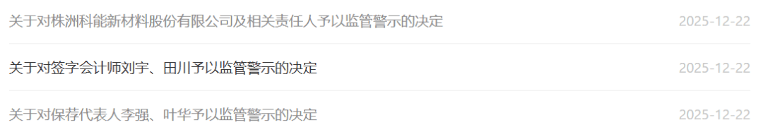 [{“type”: “page”, “title”: “拟IPO企业研发投入披露不准确,董事长及申港证券两名保代等被监管警示!_相关_审核_保荐”, “url”: “https://www.sohu.com/a/968198481_121863982”, “content”: “12月22日,上交所披露了三份监管措施决定书,事关株洲科能新材料股份有限公司申请首次公开发行股票并在科创板上市过程中,发行人、发行人时任董事长等人存在的违规行为,项目保荐代表人、项目签字会计师存在职责履行不到位的情形。 研发投入金额披露不准确 现场检查发现,发行人部分废料损失、员工薪酬计入研发费用依据不充分,合计应扣除的研发费用金额为441.17万元,占发行人披露的2021年至2023年累计研发投入的5.19%。 一是部分废料损失计入研发费用依据不充分。报告期内,发行人氧化镓颗粒制备工艺研发项目产生无回收价值的含铝废料镓2,451.21Kg,发行人将相关损失计入研发费用,并解释该废料产生的原因为辅料工业碱片中含铝导致材料污染。现场检查发现,该研发项目临时变更制备路线使用工业碱片,变更技术路线当月研发领料数量大幅增加,且发行人没有辅料工业碱片的研发领料记录,相关废料损失计入研发费用依据不充分。 二是部分研发人员认定依据不充分。现场检查发现,发行人认定的研发人员中,一名人员为退休返聘的技术顾问,发行人未对其按照协议约定的劳动纪律要求进行考勤管理、研发资料记载的其从事研发活动的具体内容和成果前后矛盾;另一名人员主要从事与研发无关的工作。发行人将上述人员认定为研发人员并将对应薪酬计入研发费用的依据不充分。 内部控制相关信息披露不准确 现场检查发现,发行人研发、销售、生产相关内部控制执行不到位,存在研发工时统计错记、多记,部分研发活动记录内容相互矛盾,研发活动内部控制相关单据不完整;”, “publish_time”: “2025-12-22T22:14:00+08:00”, “site_name”: “搜狐”}, {“type”: “page”, “title”: “两保代、两注会、发行人及三名责任人被监管警示!所涉IPO项目已终止_相关_费用_废料”, “url”: “https://www.sohu.com/a/968357954_479036”, “content”: " 经查明: 发行人在发行上市申请过程中存在以下违规行为:(一)研发投入金额披露不准确。现场检查发现,发行人部分废料损失、员工薪酬计入研发费用依据不充分,合计应扣除的研发费用金额为441.17万元,占发行人披露的2021年至2023年累计研发投入的5.19%。一是部分废料损失计入研发费用依据不充分。报告期内,发行人氧化镓颗粒制备工艺研发项目产生无回收价值的含铝废料镓2,451.", “publish_time”: “2025-12-23T11:33:00+08:00”, “site_name”: “搜狐”}, {“type”: “page”, “title”: “投行业务违规!国金证券、银河证券保代被采取监管措施-经济参考网 _ 新华社《经济参考报》官方网站”, “url”: “http://www.jjckb.cn/20251223/aa79937986e5412bb9a6b48798170bc9/c.html”, “content”: " 具体来看,此次被警示源于以下四项违规情形: 一是飞潮新材财务处理不规范情形未能有效识别并督促整改。现场检查发现,飞潮新材存在未对亏损合同计提预计负债、研发费用归集不准确、收入确认依据不充分、存货跌价计提核算不准确等财务处理不规范情形,并导致2021年、2022年多计利润总额165.85万元、144.91万元,分别占当期利润总额的6.96%和2.40%,相关信息披露不准确。 ", “publish_time”: “2025-12-23T23:27:42+08:00”, “site_name”: “经济参考网”}, {“type”: “image”, “image_url”: “https://q8.itc.cn/images01/20251223/fb35399cd35840d591289c1f07d7e4e4.png”, “image_description”: “”}, {“type”: “image”, “image_url”: “https://q3.itc.cn/images01/20251223/af1a120c700e40bab9f26fcc7a0bf578.png”, “image_description”: “”}, {“type”: “image”, “image_url”: “https://q1.itc.cn/images01/20251223/1e95cea4720b486e85320160d71c85c9.png”, “image_description”: “”}]