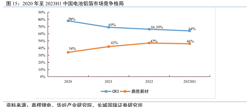 [{“type”: “page”, “title”: “2020年至2023H1中国电池铝箔市场竞争格局 - 2024年01月-行业研究数据 - 小牛行研”, “url”: “https://www.hangyan.co/charts/3277136547824010881”, “content”: “行业竞争格局较为集中,鼎胜新材市占率连续领先。电池铝箔行业 CR3 从2020 年的 78%逐年下降至 2023 年上半年的 64%,竞争格局相对集中。主要系 2021 年全球新能源汽车市场火热,带动动力电池铝箔需求量攀升,加工费上调吸引更多的企业涌入电池箔赛道。2021 年在电池箔加工费大幅上涨的背景下,鼎胜新材及时调整产品结构,将低附加值产线陆续转产生产动力电池箔,使得公司凭借先发优势巩固并扩大了电池箔领域市场份额,市占率从 2020 年的 34%增长至 2023 年H1 市占率的 46%。随着多家企业新增和技改产能的逐步释放,业内各家厂商将迎来产能、产品良率、国内外客户结构等综合实力的比拼,2024 年的电池铝箔市场仍旧可期。”, “publish_time”: “2024-01-10T09:28:34+08:00”, “site_name”: “www.hangyan.co”}, {“type”: “page”, “title”: “新能源汽车用电池铝箔市场前景、主要工艺技术_搜狐汽车_搜狐网”, “url”: “https://www.sohu.com/a/738317398_121491958”, “content”: “以下是对其前景的详细分析: 0 1 需求增长 全球对可再生能源需求增加,新能源汽车市场持续增长,推动动力锂电池需求。作为锂电池正极集流体用铝箔,电池铝箔需求持续增长。中国是全球最大新能源汽车市场,电池铝箔需求量居首。中商产业研究院预测,2023年中国电池铝箔预计产量约24万吨。 0 2 加工费和利润 电池铝箔供不应求,加工费和利润丰厚。越来越多铝箔加工企业投资电池铝箔生产。 0 3 技术发展 技术进步提升电池铝箔生产效率和质量。环保要求推动行业改进生产工艺,降低环境影响。 0 4 行业竞争 市场前景好但竞争激烈。企业需提升产品质量和服务水平,争取市场份额。 综上所述,新能源电池铝箔市场前景广阔,但也面临挑战。”, “publish_time”: “2023-11-25T08:40:00+08:00”, “site_name”: “搜狐”}, {“type”: “page”, “title”: “2024年中国锂电铝箔行业竞争格局、市场规模及未来发展趋势分析预测–手机中研网”, “url”: “https://m.chinairn.com/scfx/20240611/145930764.shtml”, “content”: " 竞争格局 锂电池铝箔行业的主要参与者包括鼎胜新材、华北铝业、东阳光、万顺新材等。其中,鼎胜新材作为行业龙头企业,其市场份额占据显著地位。行业集中度较高,少数几家企业占据大部分市场份额。 随着新能源汽车市场的迅猛增长,锂电铝箔行业需求也快速上升,推动了行业的技术创新与产业升级。目前,国内外知名的铝箔生产企业如新疆众和、东阳光科、日本住友化学等都在该领域拥有较高的市场份额和竞争力。 重点企业竞争状况 鼎胜新材:作为电池铝箔的龙头企业,鼎胜新材在技术研发、产能规模、产品质量等方面具有显著优势。其电池铝箔产量全国第一,且与多家知名锂电池企业建立了长期稳定的合作关系。 华北铝业:作为老牌电池箔制造厂商,华北铝业在行业中也占据一定地位。然而,其扩产较少,市场份额有所下降。 东阳光、万顺新材等:这些企业也在锂电池铝箔领域有所布局,但与鼎胜新材相比,其市场份额和影响力相对较小。 市场规模 随着电动汽车、智能手机等电子产品的普及,锂离子电池市场得到了快速发展,进而推动了电池铝箔市场的显著增长。预计未来几年,电池铝箔市场规模将继续保持增长态势。据预测,到2030年,全球锂离子电池正极材料用铝箔市场规模将接近更高的水平,年复合增长率(CAGR)预计为14.7%。", “publish_time”: “2024-06-11T21:41:55+08:00”, “site_name”: “m.chinairn.com”}, {“type”: “image”, “image_url”: “https://cdn.hangyan.co/charts/12/12d58bdf5b9428e82b9b05e84ce51d748aa2385610c9d63afbbbeef81ec1b556-p-16-c-0.png”, “image_description”: “”}, {“type”: “image”, “image_url”: “https://p8.itc.cn/images01/20231122/b0cd59d5c25e4366b49dcf5fabecc15d.jpeg”, “image_description”: “”}, {“type”: “image”, “image_url”: “https://p3-sign.toutiaoimg.com/tos-cn-i-axegupay5k/092cd7c873b64b9aacc0ab616a359ab1~tplv-tt-origin-web:gif.jpeg?_iz=58558&from=article.pc_detail&lk3s=953192f4&x-expires=1764647102&x-signature=YbUJjgyfmkbCk3QPsQRQSUCTaTs%3D”, “image_description”: “”}]